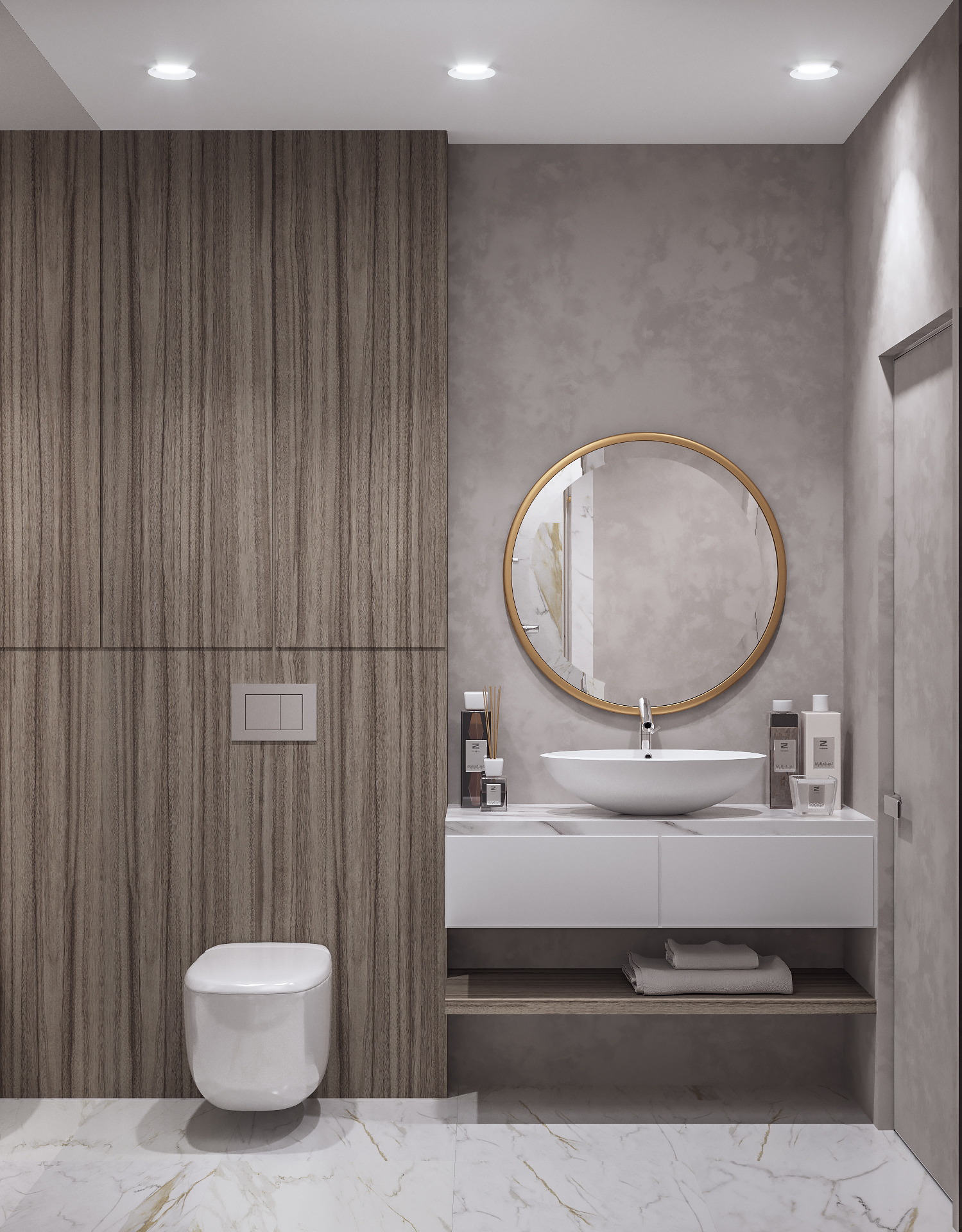 Светлые оттенки, природные натуральные текстуры мрамора, дерева и латуни делают интерьер торжественным и одновременно просторным.