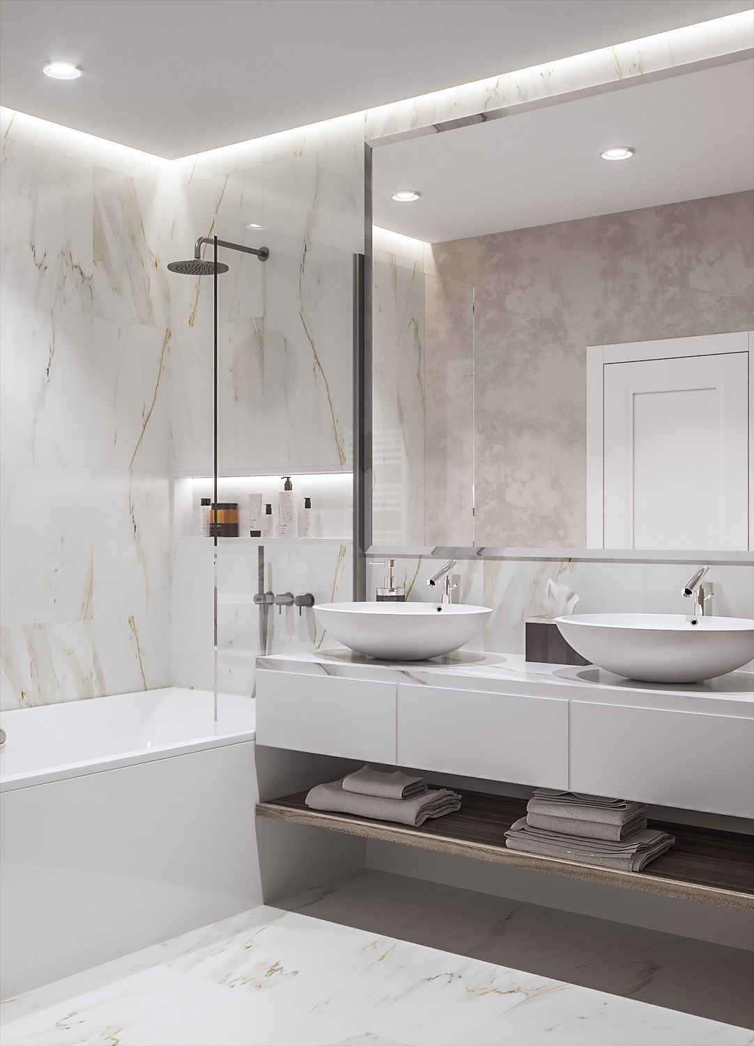 Небольшие ванные комнаты зрительно увеличиваются за счет зеркал, глянцевых поверхностей и скрытой подсветки. Также везде предусмотрено скрытое хранение.